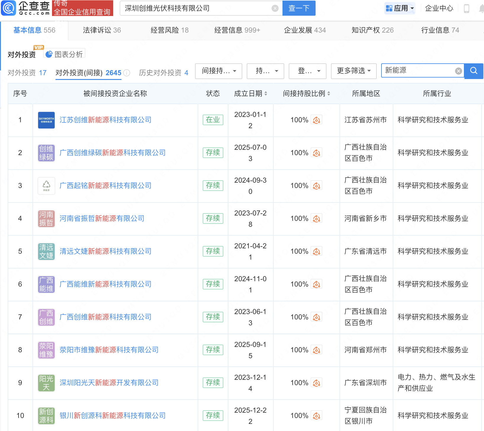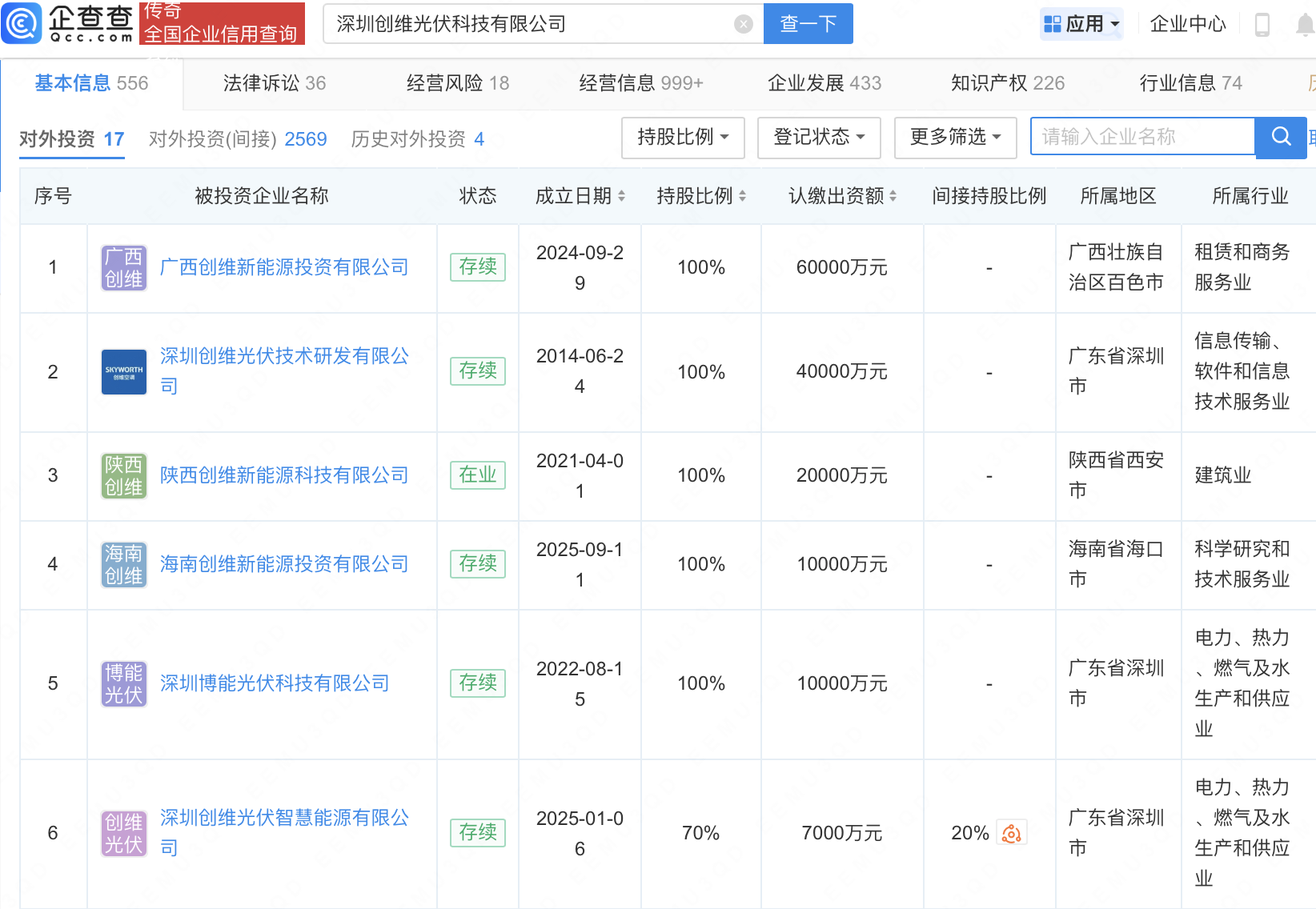 近日,深圳创维光伏科技有限公司间接投资多家新能源公司,包括百色启源科技有限公司、河北维储新能源科技有限公司、银川新创源科新能源科技有限公司等。企查查信息显示,深圳创维光伏科技有限公司成立于2020年,由创维集团有限公司旗下深圳创维-RGB电子有限公司持股70%。目前创维光伏已直接投资了17家新能源相关公司,包括深圳创维光伏技术研发有限公司、广西创维新能源投资有限公司等,其间接对外投资在业存续公司达2500余家,其中包括滁州起明光伏科技有限公司、江苏创维新能源科技有限公司、海南深博能光伏科技有限公司等。1月20日,创维集团在港交所公告,将向联交所申请以介绍方式将创维光伏股份于联交所上市及买卖。1月21日,创维集团复牌后高开超过40%,随后小幅回落。截至10时30分,创维集团股价涨幅32.24%,报6.85港元/股。